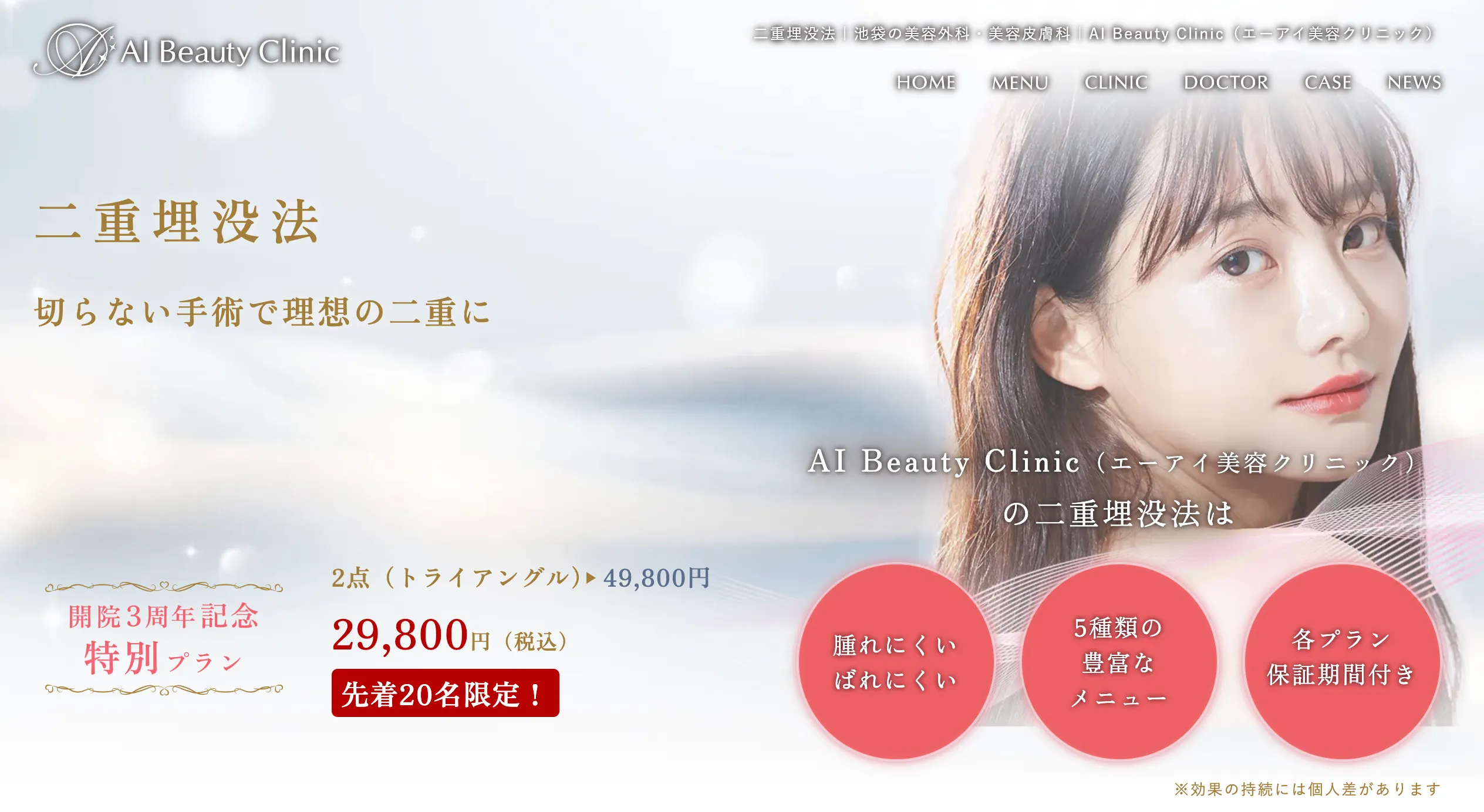 | 二重術エバーナチュラル法 | 高品質心臓外科用医療用糸を使用した埋没法 | 68,000円~ | 3年間 |