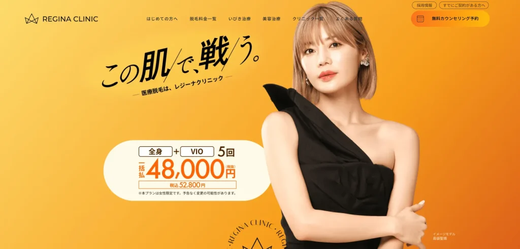 レジーナクリニック | ・当日キャンセル料無料 ・蓄熱式と熱破壊式に対応 ≫公式サイト | ・全身脱毛5回料金 52,800円 ・1当たりの料金 10,560円 | 名古屋駅 |