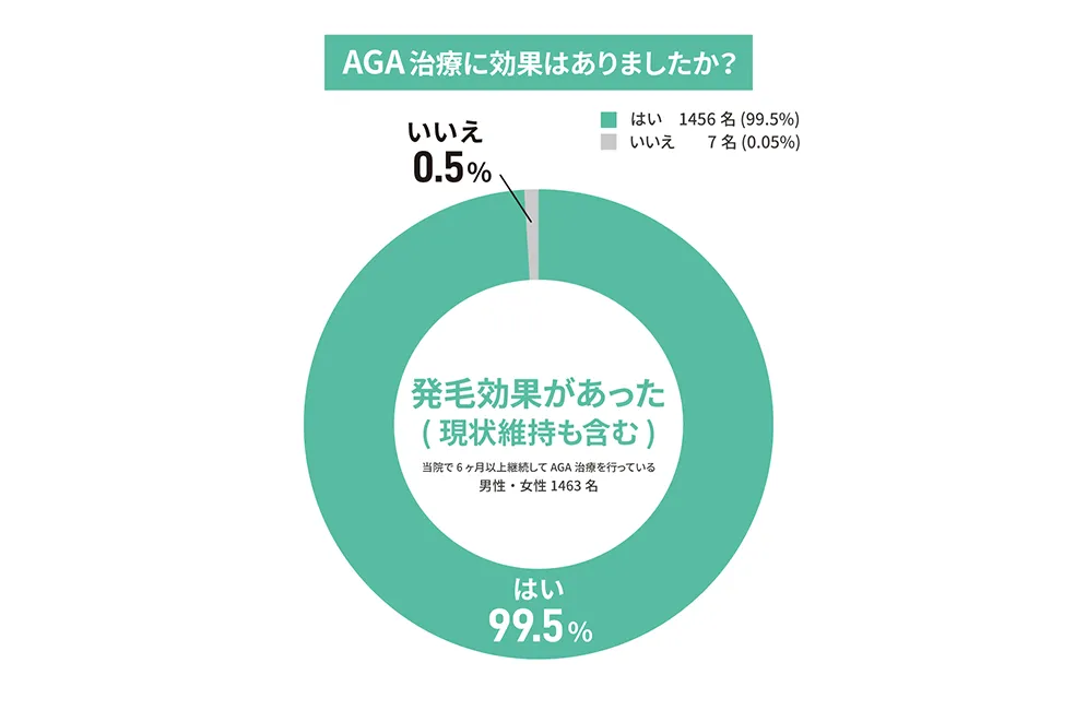 また、Dr.AGAクリニックの公式サイト上では、ほとんどの方が約1ヶ月程で抜け毛が止まり、約3ヶ月程で発毛を実感していると回答があります。個人差はありますが、治療開始6ヶ月後には99.5%の方が発毛を実感されているという調査実績もあります。