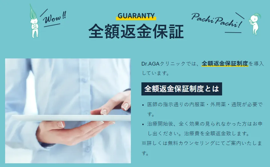もしも効果を実感できない場合は、全額返金制度を利用できる点もDr.AGAクリニックの安心材料です。