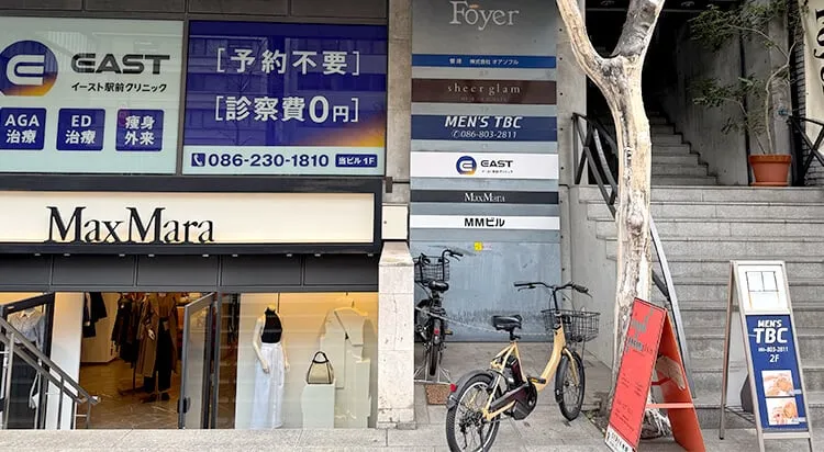 イースト駅前クリニック岡山院は、JR岡山駅東口から徒歩3分・MMビル1Fという入りやすい立地が特長です