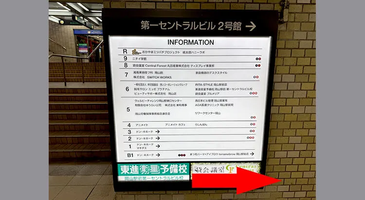JR岡山駅「東口」から徒歩3分です。MMビルの1Fが受付です。地上階のため階段・エレベーターは不要で、そのまま入れます。