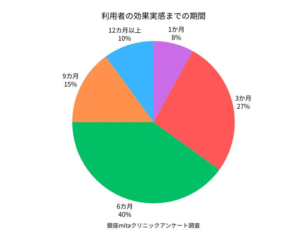 1か月以内に効果を実感する人は8%と少数で、短期間での劇的な変化を期待しすぎないことが重要です。