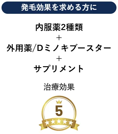 単剤処方から本格的な発毛治療まで選択でき、医師の診察と安全管理のもとで治療を進められるのが特長です。