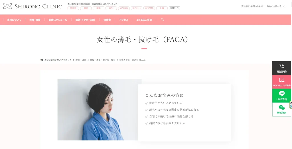 クリニックが女性の薄毛(FAGAやびまん性脱毛症、産後脱毛など)の治療実績を豊富に持っているか確認しましょう。男性のAGA治療がメインのクリニックでは、女性特有のホルモンバランスや治療薬に関する知識が不足している場合があります。